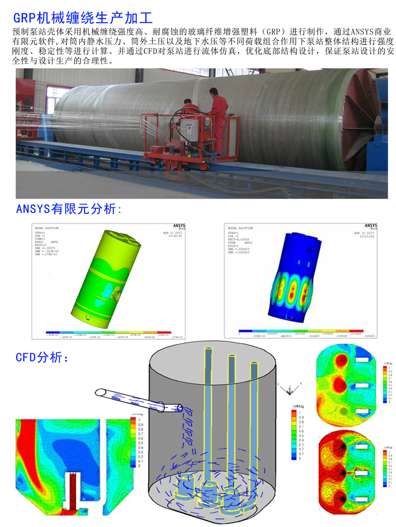 一體化預(yù)制泵站、一體化泵站產(chǎn)品概述產(chǎn)品特點 按需定制:每一套泵站都是根據(jù)客戶提供的參數(shù)設(shè)計,以保證泵站的運行工況滿足使用要求。采用的CFD流體計算,使得盡可能把淤泥等固體顆粒排出設(shè)備。工控設(shè)計:根據(jù)用戶需要可采用施耐德電氣,觸摸屏設(shè)計,含通訊RS485接口。泵站具備手動控制、自動控制和遠(yuǎn)程檢測功能APP控制,不同控制方式之間可以自由切換。 新型材質(zhì):泵站簡體結(jié)構(gòu)由纖維纏繞玻璃鋼(GRP)制成,全自動化控制連續(xù)纏繞成型,確保厚度均勻并達(dá)到設(shè)計的剛度,質(zhì)量穩(wěn)定優(yōu)良。 配件標(biāo)準(zhǔn):所有配件都在工廠內(nèi)設(shè)計、制造完成,包括壓力管路、檢修平臺、進(jìn)出水管等,出廠前進(jìn)行嚴(yán)格的調(diào)試保證泵站的可靠性高度集成:泵站作為一體化設(shè)備,成套提供:泵站簡體、壓力管道、檢修平臺、檢修爬梯、格柵過濾裝置、耦合系統(tǒng)、泵提升系統(tǒng)、通風(fēng)裝置、防滑井蓋、照明系統(tǒng)等。 外形美觀:泵站全部埋于地下,地面只留有檢修孔和控制箱,也可選配景觀式管理房置于地上,與周圍環(huán)境相協(xié)調(diào)。 成本節(jié)約:泵站為成套供應(yīng),所有內(nèi)部安裝調(diào)試工作在工廠內(nèi)完成,現(xiàn)場只需將泵站整體安裝,極大地減少了土建施工周期和工程成本,降低了業(yè)主的整體投資使用壽命:泵站簡體材質(zhì)為玻璃鋼,內(nèi)部配件使用SUS304和熱鍍鋅等防腐材質(zhì),無需維護(hù)保養(yǎng),正常使用壽命可達(dá)30年以上。 檢修方便:水泵和提籃格柵全部配有導(dǎo)軌,檢修時可以快速的拆除和安裝。 功能擴(kuò)展:預(yù)留通訊接口,方便客戶集中化管理。